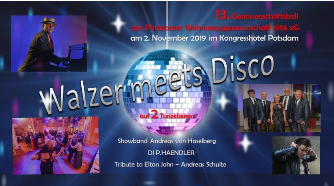 Eröffnet wurde der Abend vom Sprecher des Vorstandes, Herrn Matthias Pludra. Oberbürgermeister Herr Mike Schubert, bereits zum vierten Mal Gast bei unserem Ball, richtete ebenfalls einige Grußworte an die Gäste. Nach dem einladenden Essen vom Buffet, mit Spezialitäten aus der brandenburgischen Küche, konnten sich die Ballgäste auf ein buntes Programm mit Showeinlagen und musikalischen Highlights freuen. Durch den Abend führten, wie gewohnt perfekt, Frau Yvonne Flierl und Frau Andrea Kracht, Mitarbeiterin der PWG 1956 eG. Eröffnet wurde der Tanzabend ganz klassisch mit einem Walzer, gespielt von der Dance & Showband unter der Leitung von Andreas van Haselberg.