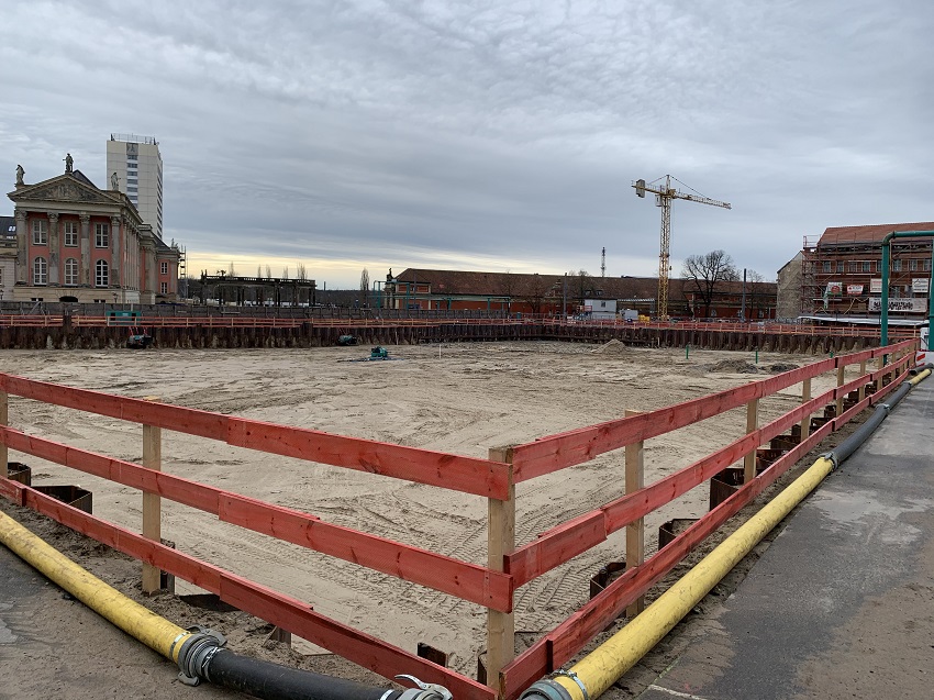 Der Baustart naht! Die Baugenehmigungen für die vier Häuser der Lose 7 und 9 sind Ende November 2020, nach fast anderthalbjährlicher Bearbeitungszeit, gerade noch rechtzeitig zum geplanten Baustart eingetroffen. Die Gebäude Alter Markt 3, Anna-Zielenziger-Straße 1-3 sowie Anna-Zielenziger-Straße 6 und 7 wurden, so, wie durch unsere Architekten entworfen, von der Bauaufsicht genehmigt. Naturgemäß gibt es einige Auflagen, die einzuhalten sind, zum Beispiel aus dem Bereich der Denkmalpflege (für die Leitfassaden der beiden Eckgebäude). Diese sind aber weitestgehend umsetzbar bzw. werden in enger Abstimmung zwischen den Architekten und der Behörde gelöst. Wer in den letzten Wochen durch die Potsdamer Innenstadt gelaufen ist, konnte sehen, wie die gemeinsame Baugrube Formen annahm. Die baugrubenumschließende Spundwand wurde eingebaut und der anstehende Boden wurde bis 50 cm über dem Grundwasserstand ausgehoben. Der nächste Schritt ist die Grundwasserabsenkung, für die man schon die grünen Rohrleitungen erkennen kann, die das abgepumpte Wasser in die Havel leiten werden. Nach der Absenkung wird bis Ende Februar die Baugrube auf die endgültige Tiefe ausgehoben.