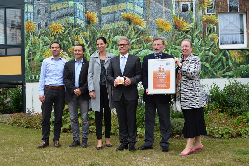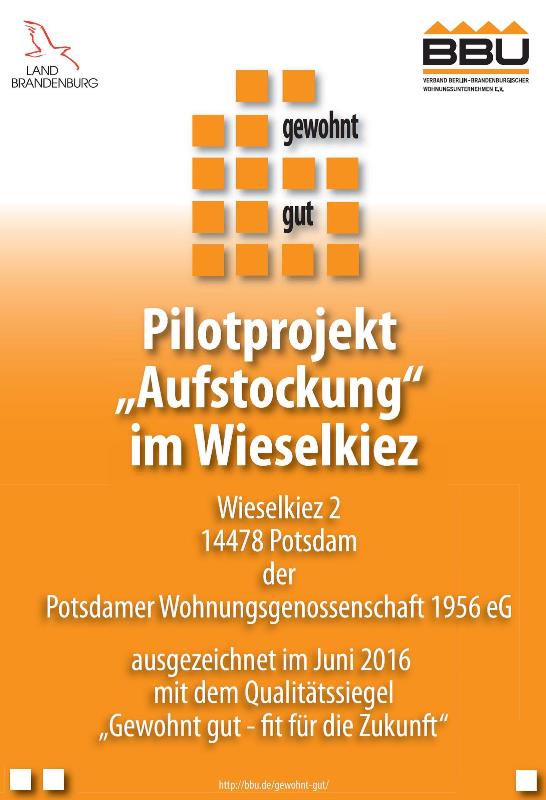 Die PWG 1956 eG hat im vergangenen Jahr im Wohngebiet Am Schlaatz einen WBS 70-Würfelbau um zwei Etagen mit sechs Wohnungen erweitert und barrierefreie Zugänglichkeit für alle Wohnungen des Hauses geschaffen. Dieses Projekt erhielt nun am 21. Juni 2016 das Qualitätssiegel „Gewohnt gut - Fit für die Zukunft“, mit dem Wohnungsunternehmen gewürdigt werden, die sich auf innovative Weise um die Anpassung des Bestandes an den demografischen Wandel und die Sicherung guten und bezahlbaren Wohnraums verdient gemacht haben. BBU-Vorstand Maren Kern erläutert die Vergabe des Siegels: „Bei der angespannten Wohnungssituation in Potsdam ist es besonders wichtig, dass es Unternehmen wie die PWG 1956 eG gibt, die soziale Verantwortung übernehmen und ihren Mitgliedern Wohnraum zu moderaten Mieten zur Verfügung stellen. Der Genossenschaft ist dabei der Spagat gelungen, das Projekt ‚Aufstockung im Wieselkiez‘ hochwertig und trotzdem wirtschaftlich umzusetzen. Eine große Leistung, die wir sehr gerne auszeichnen!“ „Nachgefragter Wohnraum in guter Lage, generationengerecht und barrierearm, baulich innovativ, architektonisch ansprechend, bei einer Nutzung von bereits bebauter Fläche und das Ganze zu sozialverträglichen Mieten: Das Pilotprojekt bietet ein tolles Gesamtpaket, von dem sich die Stadt Potsdam nur wünschen kann, wenn es die Genossenschaft in ihrem Bestand wiederholen kann“, begründet Ines Jesse, Staatssekretärin im Ministerium für Infrastruktur und Landesplanung des Landes Brandenburg, die Auszeichnung.