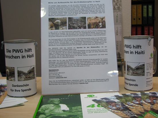 Die Vernissage fand am 11. Februar 2010 statt. Vernissagen in der Spareinrichtung werden regelmäßig mit sozialen Anliegen verbunden. Dieses Mal wurde zu einer Spende aufgerufen, um die von der DESWOS (Deutsche Entwicklungshilfe für soziales Wohnungs- und Siedlungswesen e.V.) organisierte Aufbauhilfe für die Erdbebenopfer in Haiti zu unterstützen.